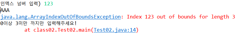 System.out.println("로그 : 인덱스 범위 예외 발생" + e.getMessage());
