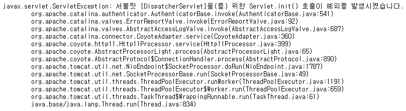 javax.servlet.ServletException: 서블릿 [DispatcherServlet]을(를) 위한 Servlet.init() 호출이 예외를 발생시켰습니다.