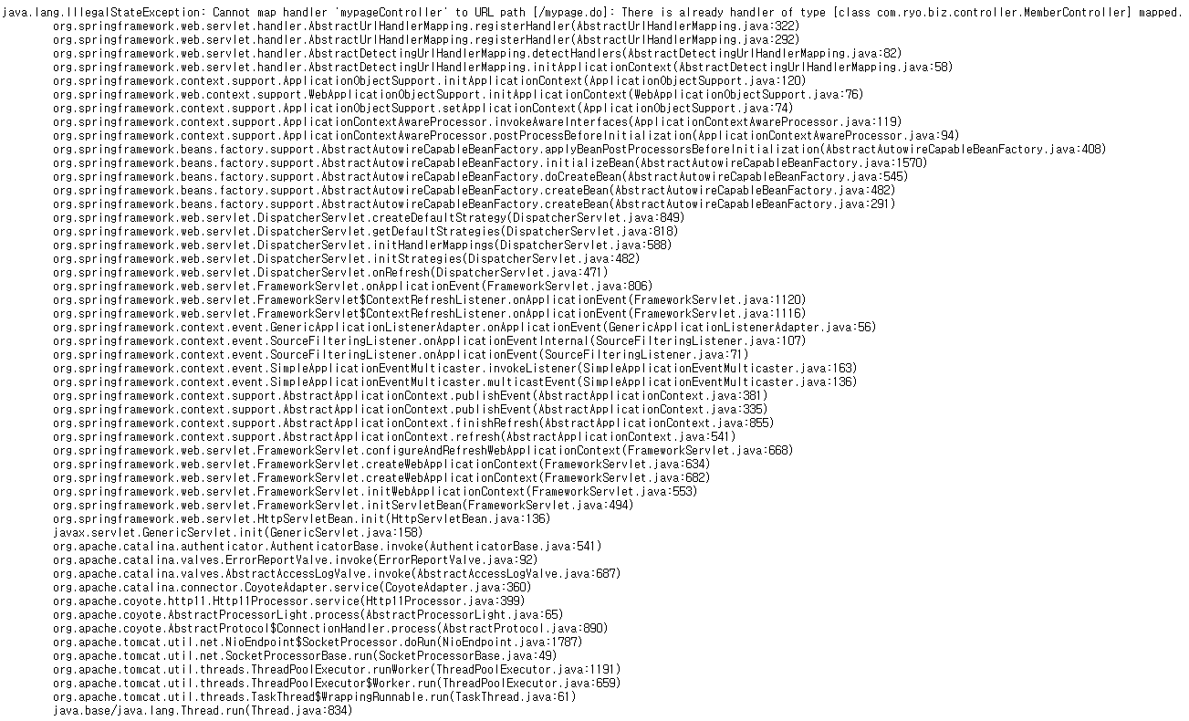 org.springframework.beans.factory.BeanCreationException: Error creating bean with name 'org.springframework.web.servlet.mvc.annotation.DefaultAnnotationHandlerMapping': Initialization of bean failed; nested exception is java.lang.IllegalStateException: Cannot map handler 'mypageController' to URL path [/mypage.do]: There is already handler of type [class com.ryo.biz.controller.MemberController] mapped.