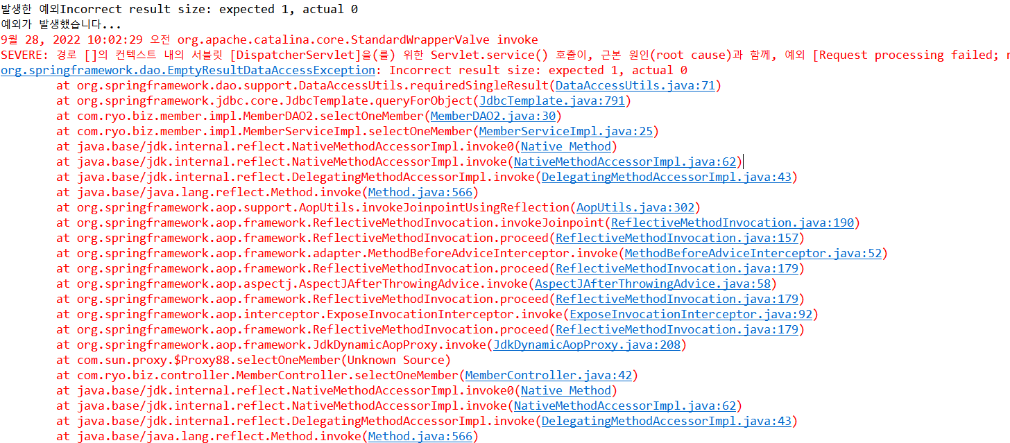 > 결과값이 1개가 아닐 때 나타나는 jdbcTemplate 쪽의 에러로 보인다.