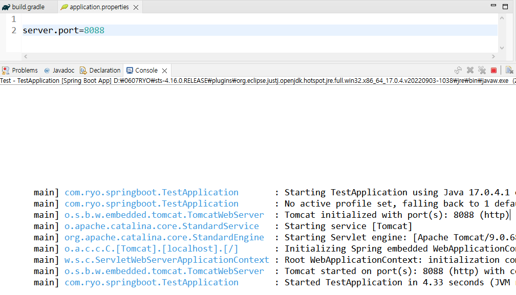 >> 내장된 톰캣 서버의 기본 포트 번호는 8080