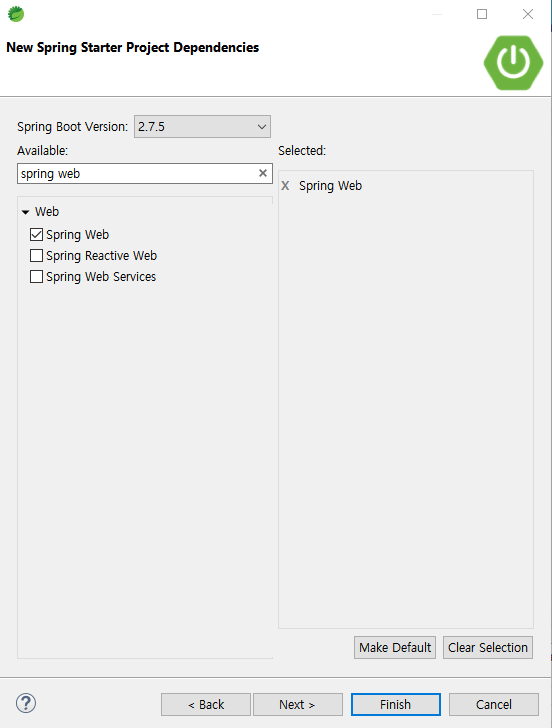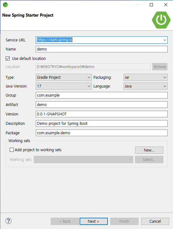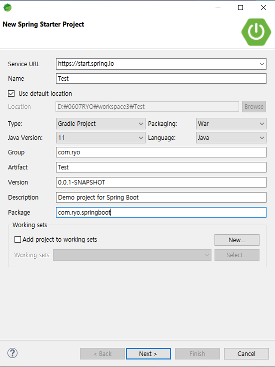 >>> Create new Spring Starter Project가 뜨면 잘 된 것!
