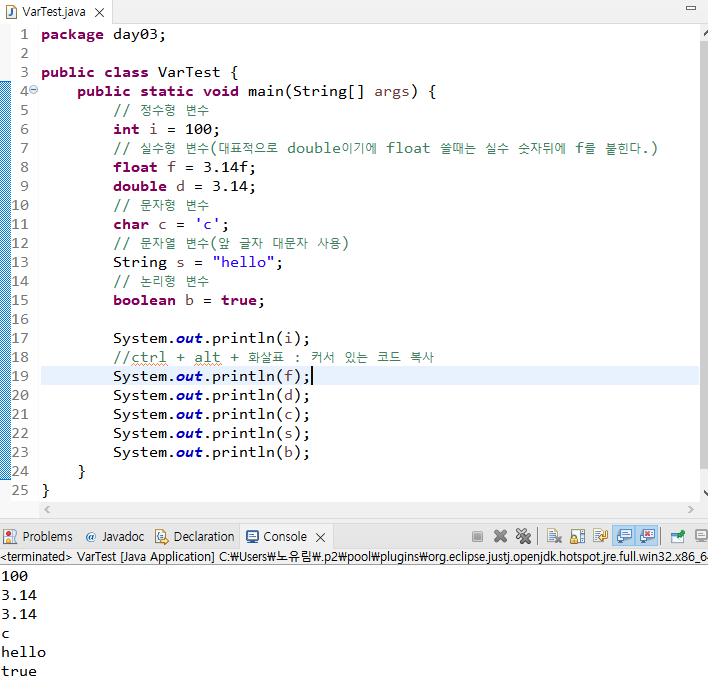 실수형 | float, double(기본) | 4, 8 | 3.14f, 3.14 |