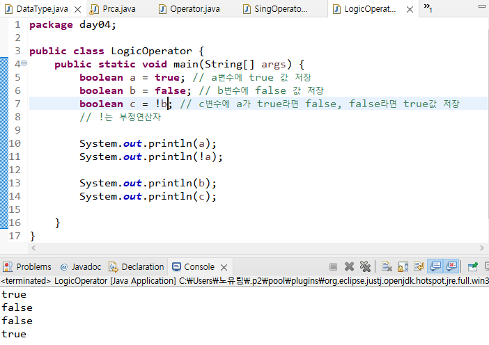 : 논리형 변수 앞에 붙어 변수의 값을 변경