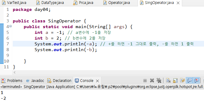 : 변수 앞에 붙어 변수의 값의 부호를 변경