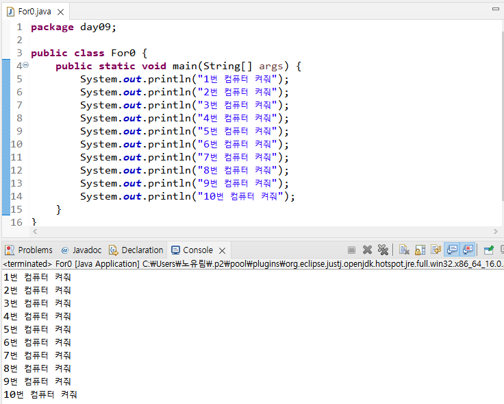 ? " 컴퓨터번호가 1번부터 시작해서 10번보다 작거나 같은 때까지 컴퓨터를 켜주고