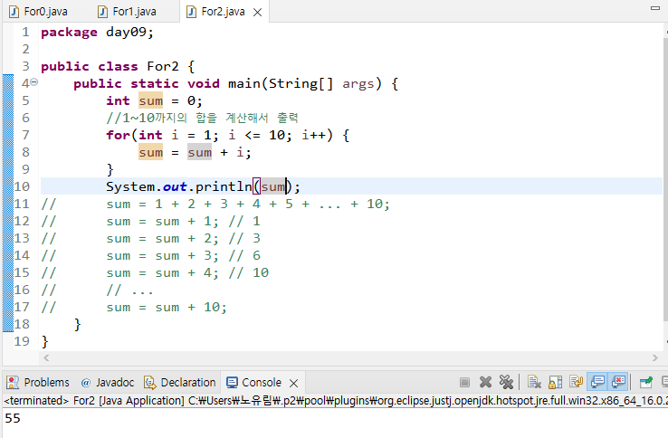// 초기식 : 변수 생성, 조건식 : 변수의 마지노선 설정, 증감식 : 변수의 변화량 설정