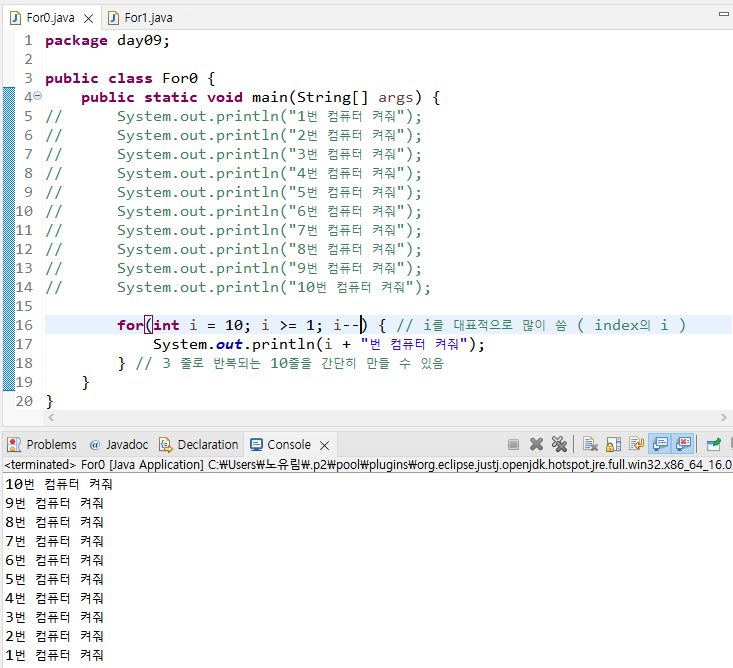 ? " 컴퓨터 번호가 10번부터 시작해서 1번보다 크거나 같을 때까지