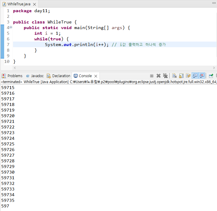- 무한반복 : 반복이 멈추지 않고 계속해서 실행되는 것을 의미