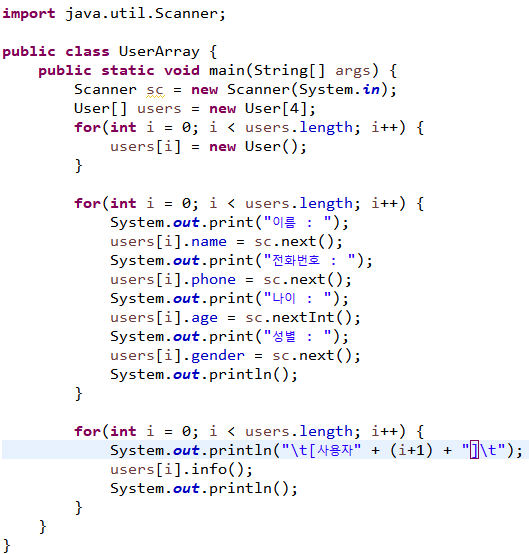 user클래스로 만들어진 다음 객체를 묶어서 관리할 객체 배열 users를 생성하기