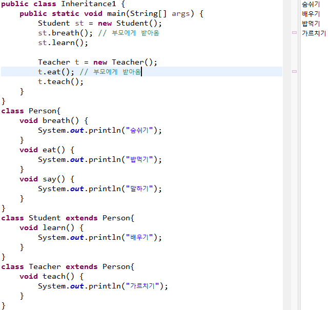 사람의 기능을 상속받는 학생클래스와 선생클래스 생성하기