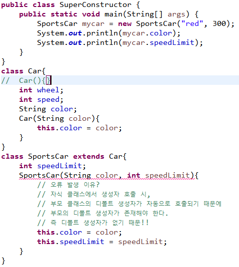 - 무조건 자식클래스의 생성자 첫 줄에서 이루어짐