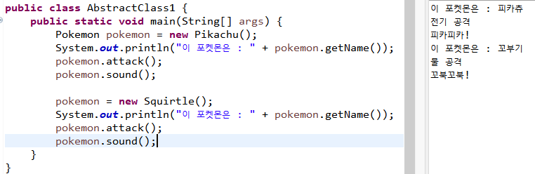 구체적인 피카츄, 꼬부기 클래스를 구현하는 예제