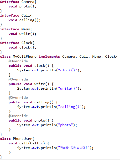 인터페이스를 사용하면 MyCellPhone 클래스가 여러 기능으로 정의된