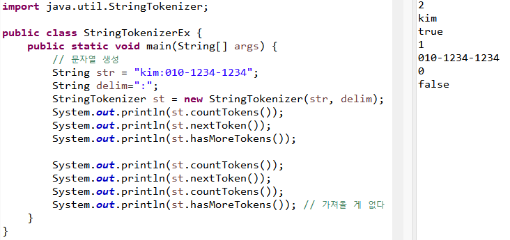 - hasMoreTokens() : 다음 토큰이 존재하면 true, 존재하지 않으면 false