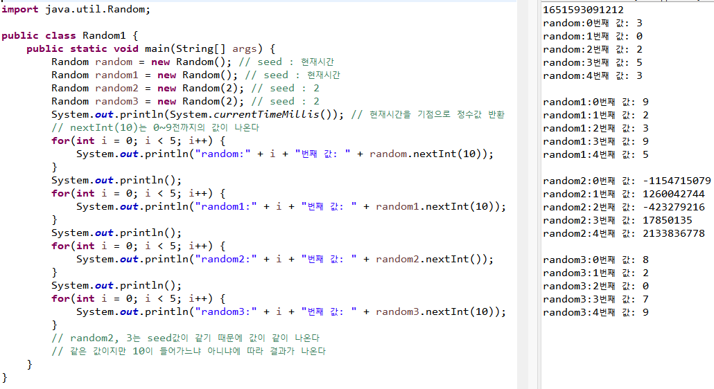 > Random()(디폴트 생성자) : 현재 시간을 seed 값(기준값)으로 인스턴스 생성