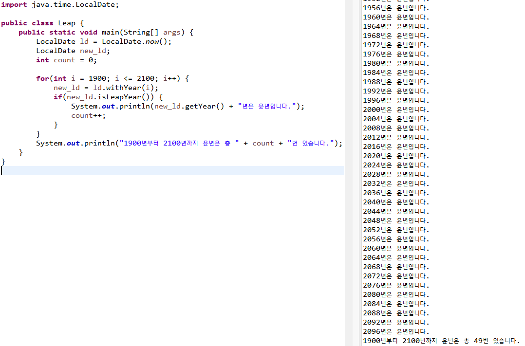 1900년부터 2100년까지 윤년이 언제인지, 몇 번 있는지 알아보는 코드