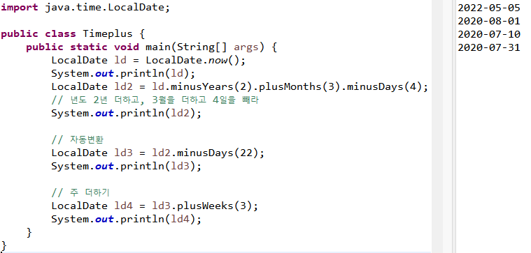- ZoneDateTime 클래스는 now() 메서드 뒤에 ZoneId를 매개값으로 넘겨야 함