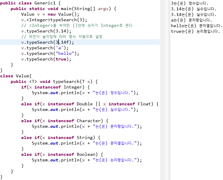 제네릭 메서드를 사용하여, 들어온 값이 어떤 자료형인지 알려주는 실습
