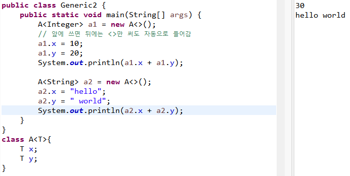 1) 제네릭 클래스 : 클래스 뒤에 제네릭 기법 사용