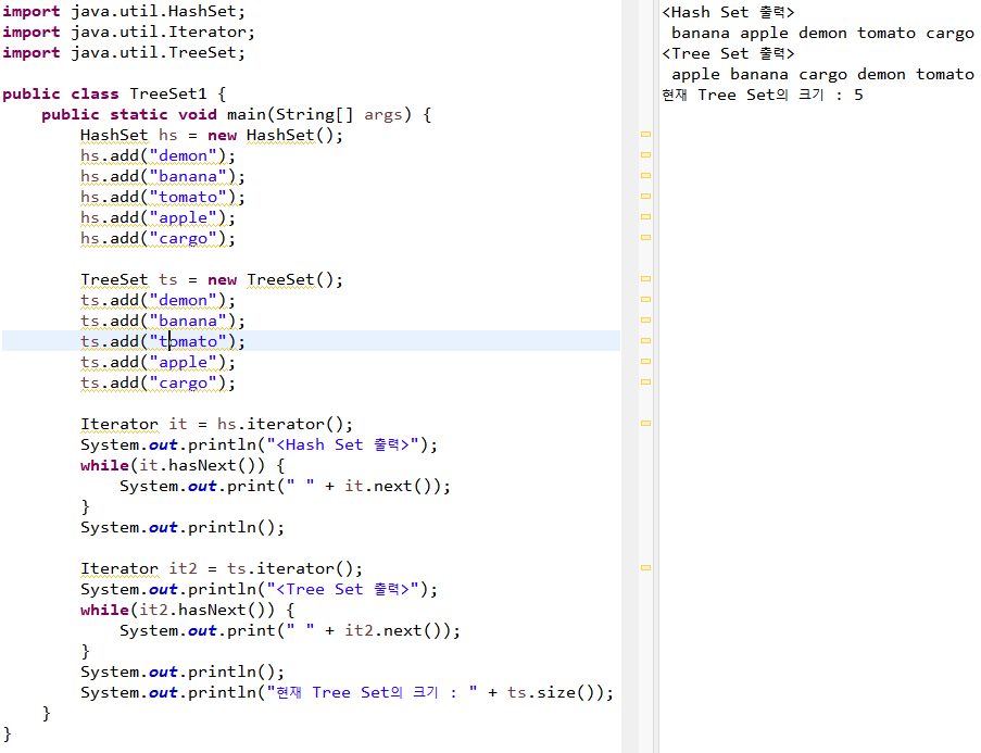 HashSet과 TreeSet의 요소를 저장한 결과를 비교