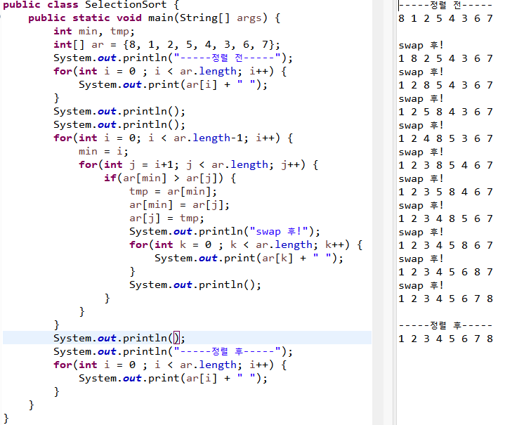 2) 가장 작은 값을 찾으면 그 값을 현재 인덱스의 값과 바꿔준다.