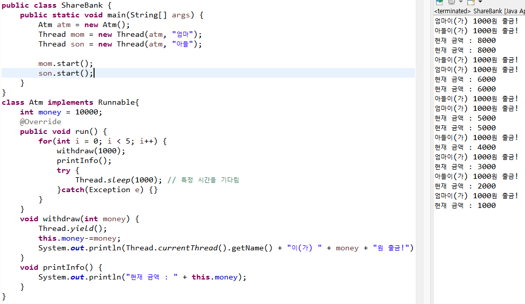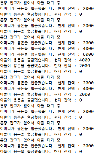 엄마랑 아들이 동시에 돈을 뽑는 작업을 스레드를 사용해 멀티태스킹으로 구현했을 때,