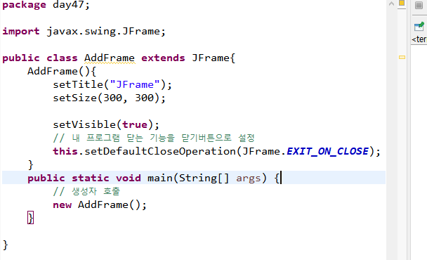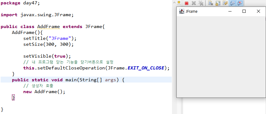 - JFrame 클래스를 상속받아, 나만의 프레임 클래스 작성