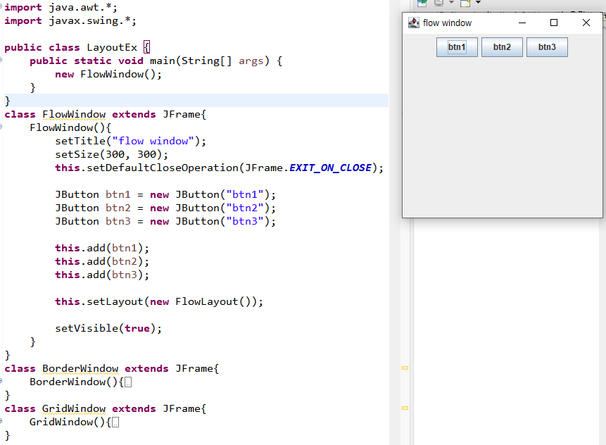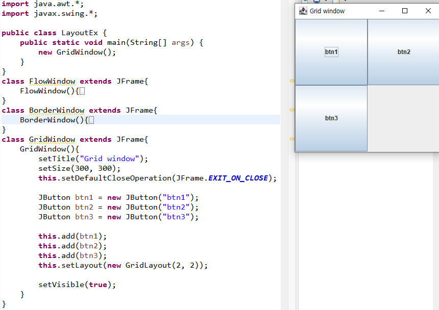 - javax.swing 패키지에 JFrame, JWindow, JPanel, JButton, JLabel 등이 존재