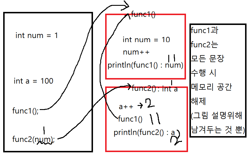 System.out.println("func2()에서 받은 num : " + num);